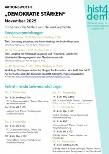 Mit diesem Newsletter informieren wir Sie regelmäßig und gebündelt über alles Wichtige rund um Ihr Geschichtsstudium. Sie finden hier aktuelle Hinweise zu Lehrveranstaltungen, Kolloquien, Gastvorträgen und anderen fachspezifischen Veranstaltungen. Auch über Fristen, … Weiterlesen
